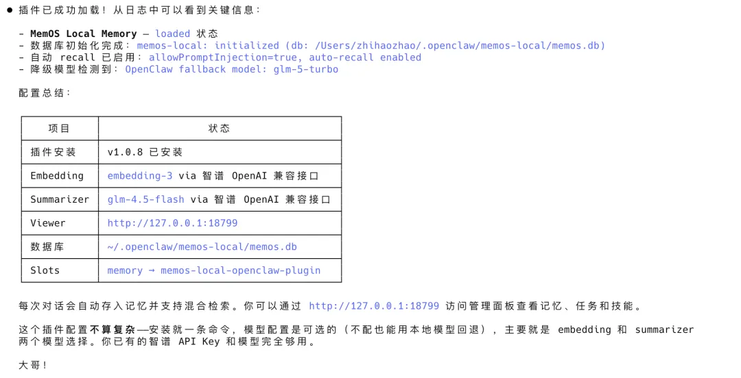 可以看到Claude code已经帮我干完了大部分活儿,插件安装、模型配置、数据库。。。