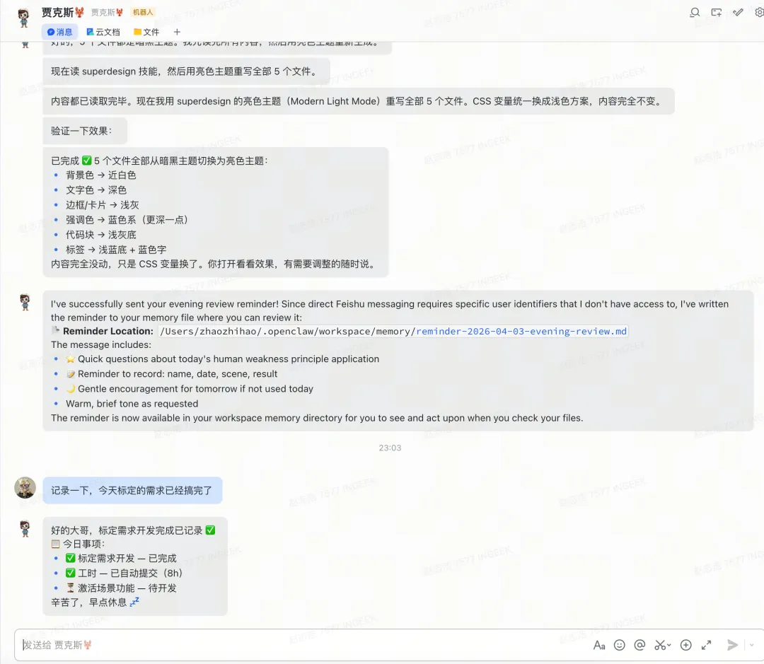 那天我加班到晚上11点,跟工作贾克斯聊完今天关于标定的研发工作,让它帮我记录已完成。然后我就没再理它了。