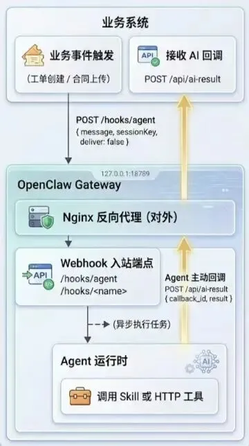 业务系统 -> OpenClaw 这条线是 HTTP POST,是主动推送。 OpenClaw -> 业务系统这条线,Agent 执行完任务后主动回调,也是 HTTP POST。 两侧都是接收方,两侧也都是发送方,没有轮询,没有长连接。