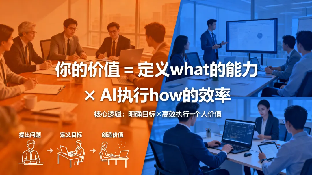「你的价值 = 定义what的能力 × AI执行how的效率」 未来5年,职场的竞争不再是“谁技能更熟练”,而是“谁能提出更好的问题、定义更清晰的目标、创造更独特的价值”。