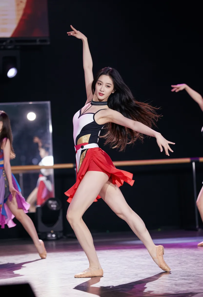 8K, ultra-detailed, masterpiece, best quality, performance photography, stage dance art style, Asian female performing on stage, wearing elegant red dance dress, long black hair flowing with movement, graceful and seductive pose, dancing with body in graceful arch, one arm extended upward, other arm at side, natural expression with confident smile, professional stage setting with stage lights and backdrop, dramatic stage lighting creating colorful shadows, front view three-quarter shot, sharp focus on face and body, soft focus on stage background, dramatic lighting from stage lights creating rim light, dramatic atmosphere, vibrant color palette (red, black, gold, white), 85mm f1.4, cinematic depth of field