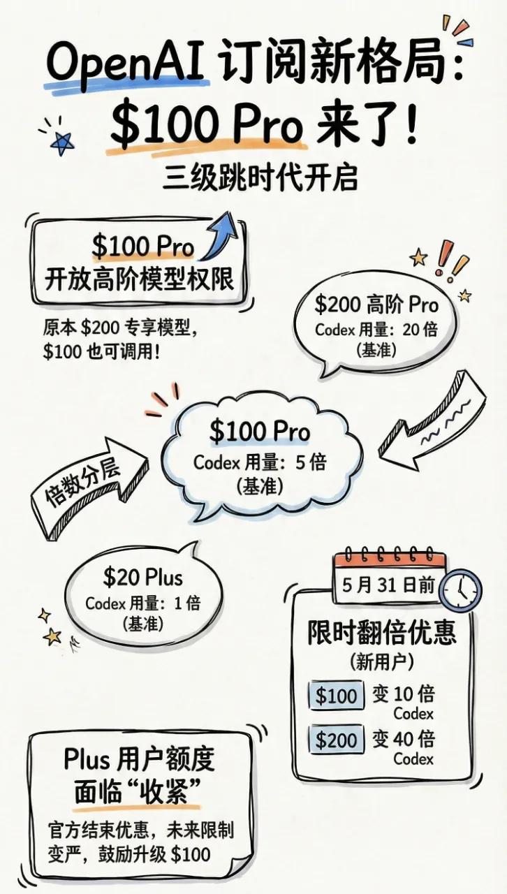另外为了庆祝新Pro计划上线,到5月31日为止,新100刀Pro用户的Codex都是10倍(正常为5倍)