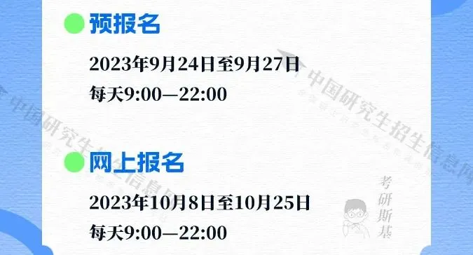 24考研报名时间已经定了!预报名时间在9月24日至27日、正式报名时间在10月8日至25日,每天9:00-22:00。大家注意在指定时间段登陆研招网进行信息填报,千万不要因过度投入学习忘记了报名。
