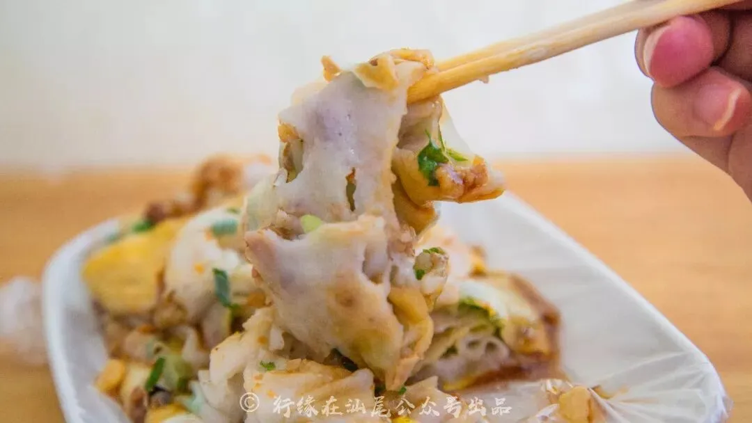 它是汕尾地区当地的特色小吃之一,形近似肠粉,但吃起来口感却比肠粉好很多。