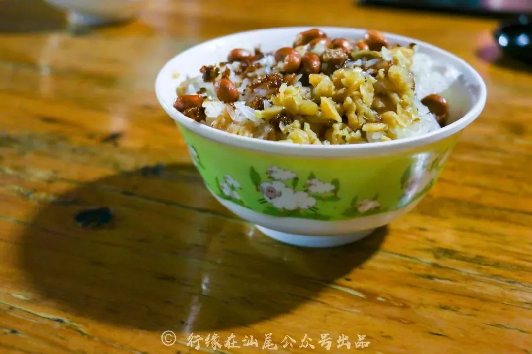 一碗菜茶丰富多彩,虾米干、腊肠、芋粒还有少不了的赤豆、黄豆、粉丝蔬菜等,芋粒是经过下锅油炸的,一定要趁早吃,泡久了就软化了。