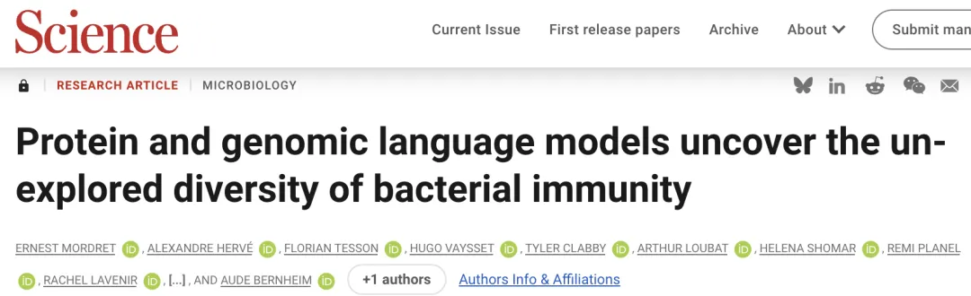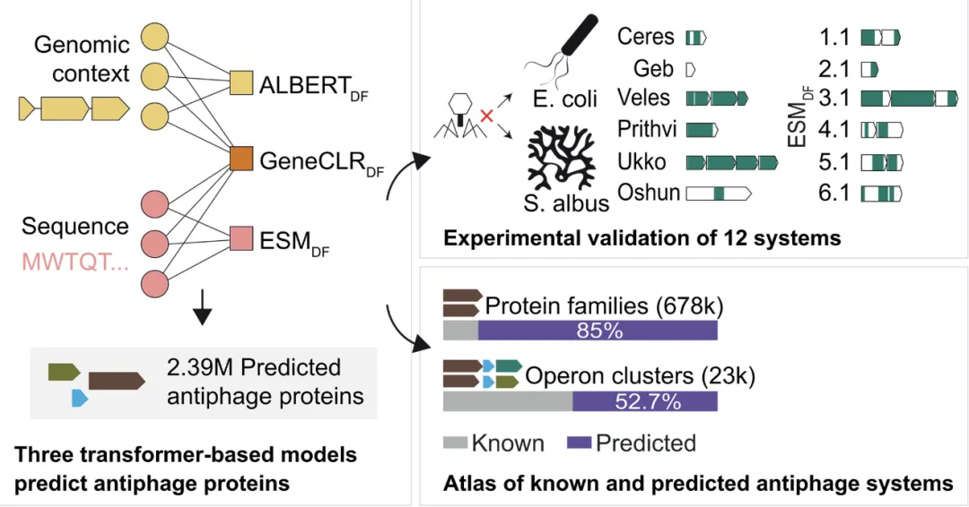 Science | 基于AI语言模型系统发掘超大规模细菌抗噬菌体防御系统细菌编码了高度多样化的抗病毒防御系统,目前已有超过250种系统通过实验验证,涵盖广泛的分子机制。随着计算与实验筛选的持续推进,新的防御系统不断被发现,表明其真实多样性远超当前认知。然而,抗噬菌体防御系统的整体规模与组成仍未被系统解析。 尽管多样性尚不明确,已知防御系统在蛋白序列与基因组结构层面呈现出一定共性特征,例如特定功能结构域,以及在“防御岛”或前噬菌体区域的富集。这提示抗噬菌体系统可通过跨机制的模式进行识别,而不仅依赖传统的序列同源性。 2026年4月2日,法国巴斯德所Aude Bernheim 团队在《Science 》发表研究,构建了三种互补的蛋白质与基因组语言模型,实现对抗噬菌体系统的规模化识别, 系统发掘出海量新型抗噬菌体蛋白,构建了细菌抗噬菌体防御系统图谱数据库 ,显著拓展了对细菌免疫体系的整体认知 。 主要结果 (1)开发三种互补的深度学习模型,突破传统同源性搜索局限,实现泛基因组尺度的抗噬菌体功能预测: a)ALBERTDF:基于局部基因组上下文推断防御功能,不依赖蛋白序列; b)ESMDF:基于蛋白质语言模型,从氨基酸序列中提取特征; c)GeneCLRDF:整合序列与基因组信息,性能最佳,在基准测试中达到99%精确率和92%召回率。 (2)通过在大肠杆菌和白色链霉菌中的实验验证,鉴定出12种此前未知的抗噬菌体防御系统,证实模型预测的可靠性。 (3)新发现系统涵盖多种功能结构域(如脱氧核酸酶、肽酶等),并包含此前未与抗病毒免疫相关的蛋白类型,表明模型能够捕捉超越已知机制的功能特征。 (4)在超过32,000个细菌基因组中进行系统预测,结果显示平均约1.5%的基因参与抗病毒防御,其中超过85%的蛋白家族此前未被注释为免疫相关。 (5)共预测约239万个抗噬菌体蛋白,形成约23,000个操纵子家族,其中绝大多数为全新防御单元。 (6)基于上述结果构建细菌抗病毒免疫图谱(atlas),揭示一个远超既往认知的广阔防御体系,并通过交互式平台公开共享。 研究意义 (1)提出了用于大规模发现抗噬菌体防御系统的深度学习框架,并构建了系统性的细菌抗噬菌体免疫图谱。 (2)该方法显著拓展了对细菌免疫多样性的认识,并为后续的功能研究与机制解析提供了重要基础。 Ernest Mordret et al. ,Protein and genomic language models uncover the unexplored diversity of bacterial immunity.Science392,eadv8275(2026). DOI:10.1126/science.adv8275