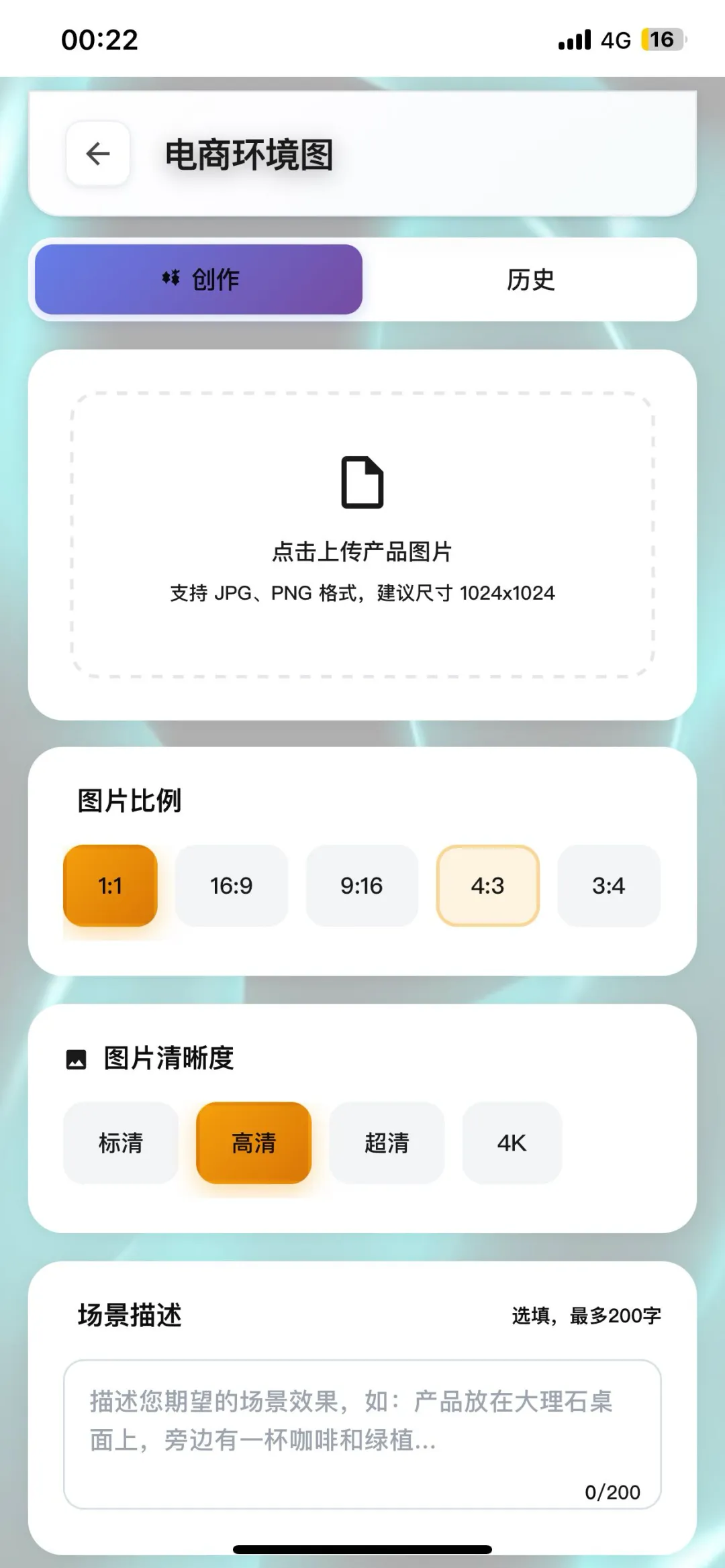 该功能支持通过一张产品白底图或实拍图,自动补全光影细节并生成多维场景。