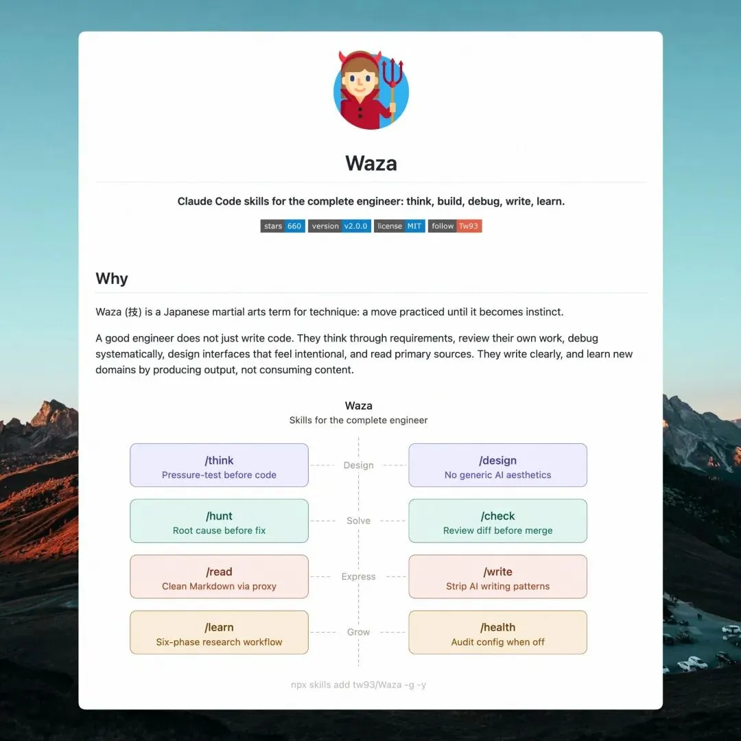 内卷焦虑不是我想要的,我还是要坚定走自己的方向,这里就要来分享我最喜欢的一位优质博主,他不追热点不焦虑,利用ai做出更多好内容,推荐所有人要关注他。这是他的分享,AI 时代一个好的工程师应该具备的 8 个能力:1、会思考,AI 写代码很快,但方向错了越快越远,好的工程师在动手前会先质疑问题本身,压测方案,脑子里有清晰的架构再让 AI 去执行,/think 就是把这个习惯固定下来。 2、会设计,做产品不只是把功能实现了,AI 生成的东西很容易千篇一律,好的工程师对交付物有审美要求,出来的东西要有明确的设计方向,/design 做的就是这件事。 3、会排查,AI 改 bug 最容易陷入"改了试试"的循环,好的工程师遇到问题会系统化定位,确认根因再动手修,一次到位,这个习惯我沉淀成了 /hunt。 4、会检查,AI 生成的代码更需要人来把关,合并前先审一遍 diff,能自动修的修掉,需要判断的归拢到一起,用证据验证而不是凭感觉收工,这个是 /check。 5、会阅读,好的工程师习惯读一手资料而不是二手总结,把 URL 或 PDF 转成干净的 Markdown 直接进工作流,/read 做的就是这件事。 6、会写作,技术再强,写不清楚别人就接收不到,好的工程师能把学到的、想表达的东西清晰地传递给对应的受众,/write 帮你把这一步做好。 7、会学习,AI 时代技术迭代更快,进入一个陌生领域不是刷几篇文章就完了,而是收集、消化、提纲、初稿、打磨、发布,用输出驱动学习,/learn 就是这套流程。 8、会维护,好的工程师不只关注业务代码,工具链本身也需要体检,CLAUDE.md、rules、hooks、MCP 这些配置感觉不对的时候跑一下 /health 就知道问题在哪。关注 AI / 一人公司 / 出海 / 远程工作