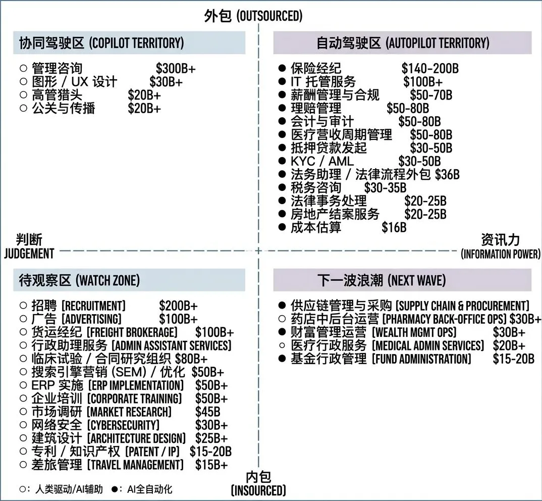 将每个服务垂直领域按智能判断比和外包/内包比绘制在图表上,即可生成一张优先级地图,括号内为劳动力总需求量 (TAM)。此列表仅供参考。