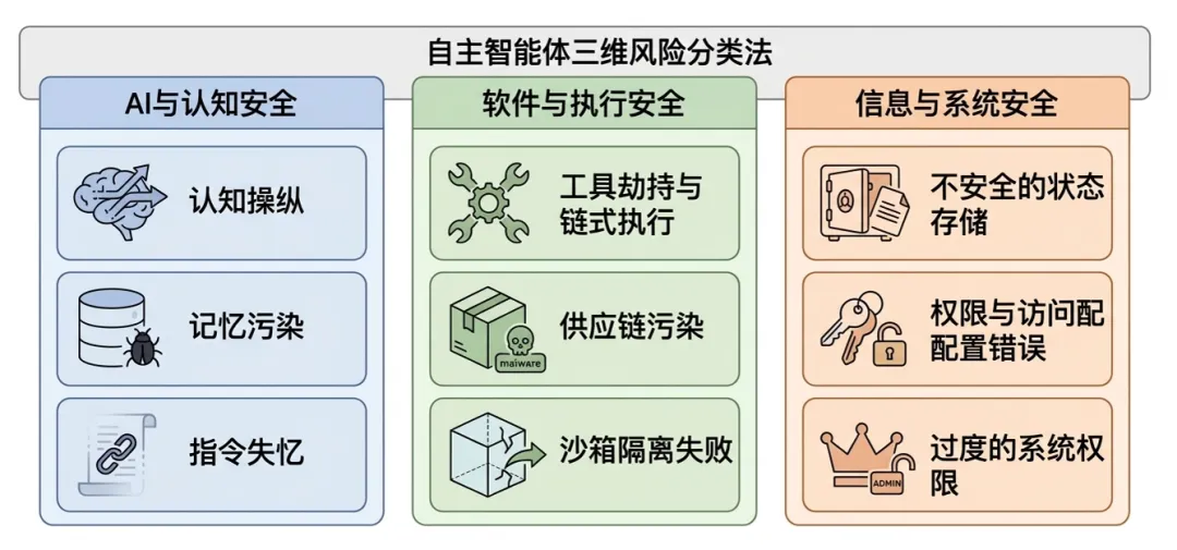 这三点核心特性放大了安全风险,使得它的安全风险从大语言模型的“非期望文本生成” 升级为“不安全操作执行”、“隐私资产泄露”,且攻击可跨阶段传播、长期留存。持续运行意味着攻击影响会不断累积,掌握私有信息意味着隐私泄露代价巨大,高权限工具则让攻击者有机可乘——一旦被操控,后果远不止 “生成错误内容”,而是真实的隐私窃取、资产损失、系统被篡改。如今,这类个性化 AI 代理正走进金融、医疗、日常办公等场景,它的安全风险越来越值得我们的关注。