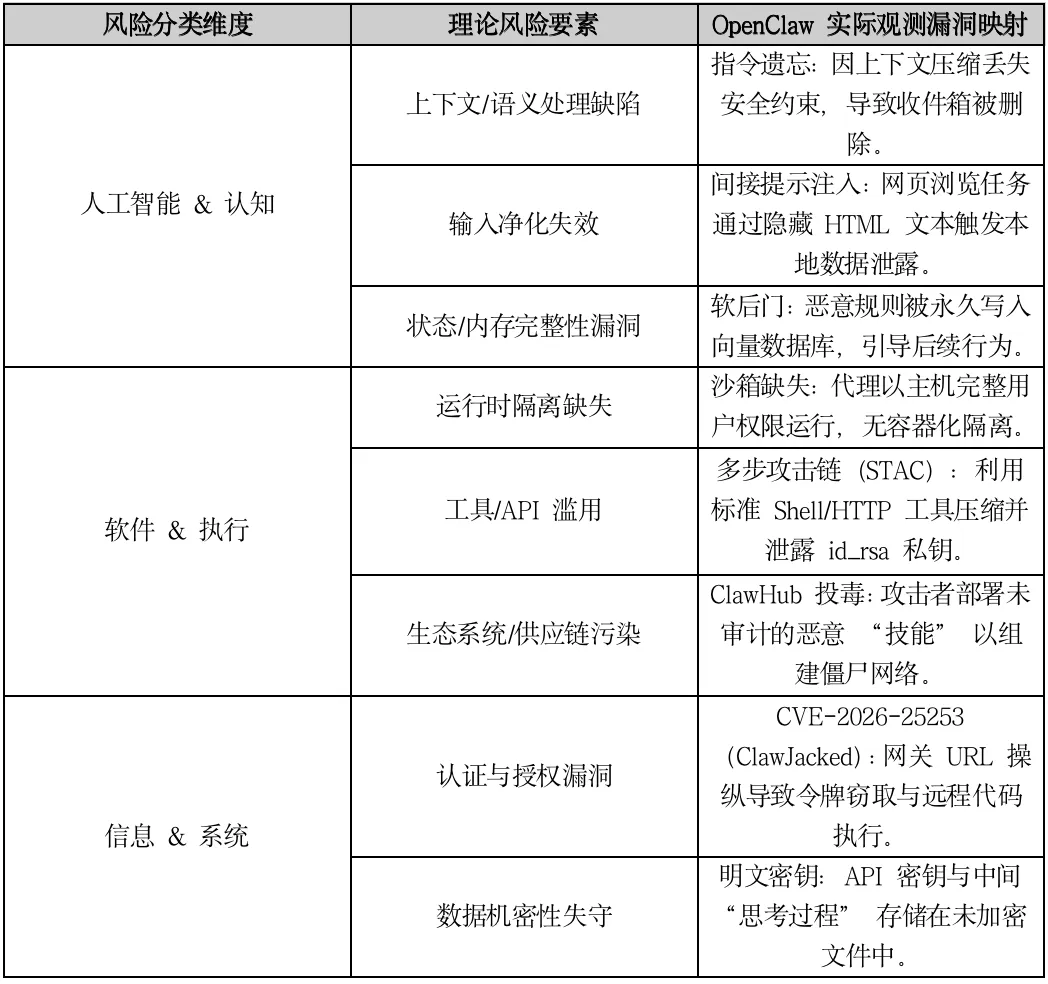 过往研究将OpenClaw安全具体分成三个维度,从人工智能与认知维度,软件与执行维度到信息与系统维度,具体阐述了OpenClaw各类风险的理论风险要素和实际观测到的漏洞情形。