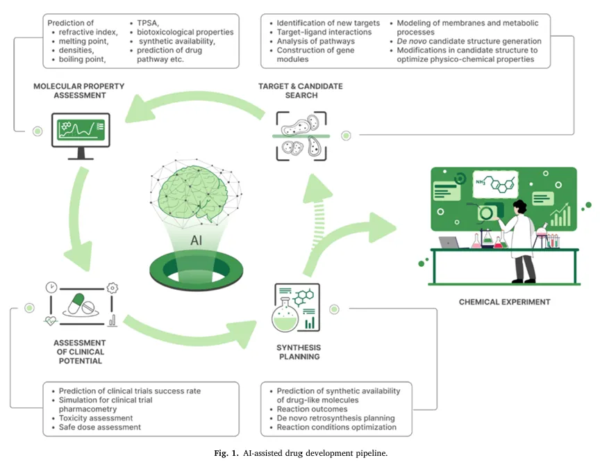 论文系统梳理了 AI 技术在新药研发全链条的落地场景,以及制药工业端规模化应用的成熟平台与解决方案。
