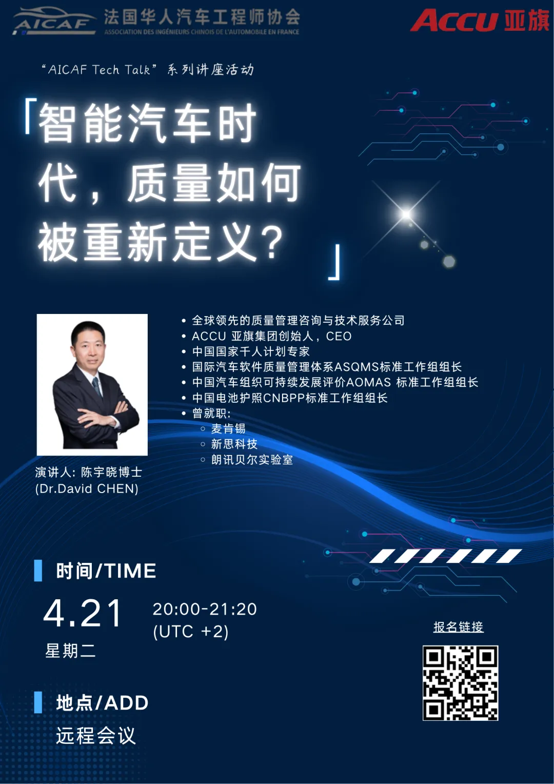 “AICAF Tech Talk”系列讲座活动是法国华人汽车工程师协会AICAF于2025年推出的一系列行业专家技术交流讲座活动,本期我们有幸邀请到ACCU亚旗集团的陈宇晓博士,来跟大家做深度探讨。