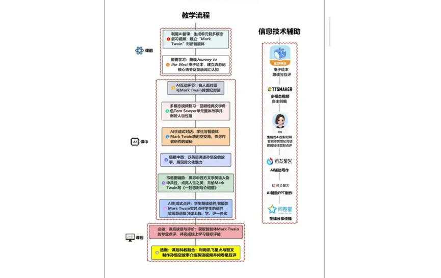 这份案例的AI应用,完美回应了这些要求。它不是用AI做个PPT或放个视频,而是让AI成为双线虚拟双师,贯穿课前、课中、课后: