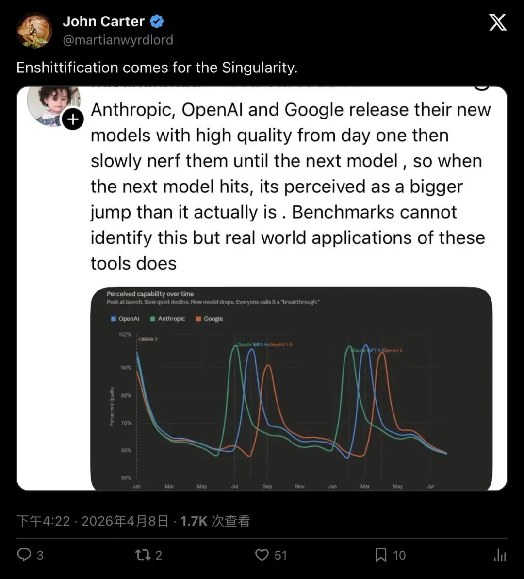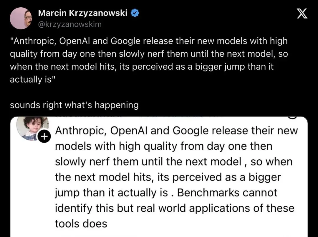 这句话之所以能引爆传播,是因为它精准捕捉到了一种弥漫在AI用户群体中的集体焦虑:我每月付20美元订阅的模型,还是上个月那个模型吗?