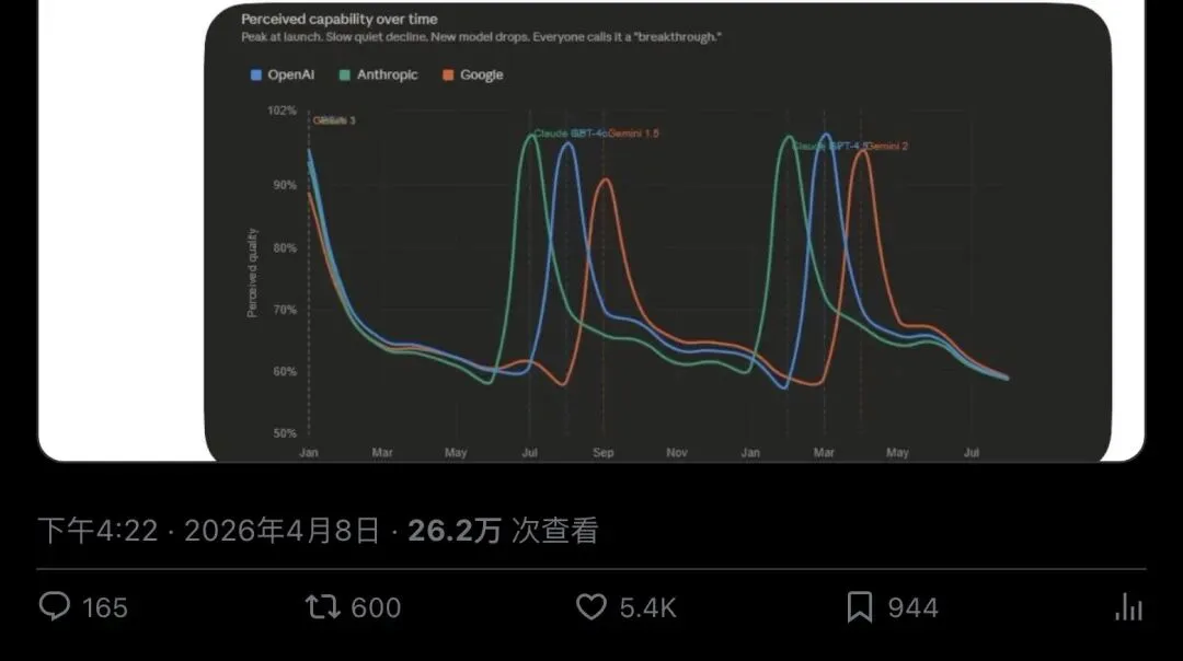 图表标题写着"Perceived capability over time"(感知能力随时间变化),三条曲线分别代表OpenAI、Anthropic和Google。每条曲线的走势惊人地一致:新模型发布时冲到峰值,然后缓慢下滑,直到下一个新模型发布,再次冲高——形成一个又一个"锯齿形"的波峰波谷。