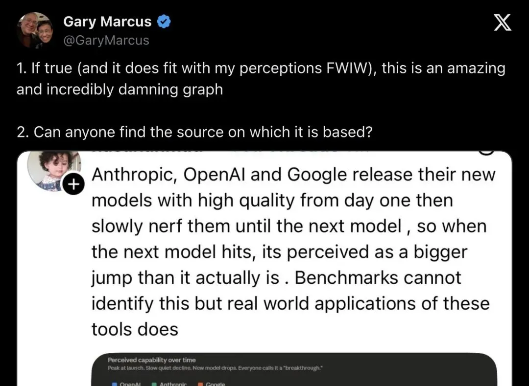 一条推文、一张图,把Anthropic、OpenAI和Google同时钉在了耻辱柱上——有人指控:三大AI巨头发布新模型时故意拉满质量,然后在后续数周里悄悄"nerf"(削弱),等到下一代模型发布时,用户就会觉得"哇,进步好大"。这条推文24小时内获得超过5000赞、26万次浏览,连AI批评界的"教父"Gary Marcus都坐不住了。真相究竟如何?