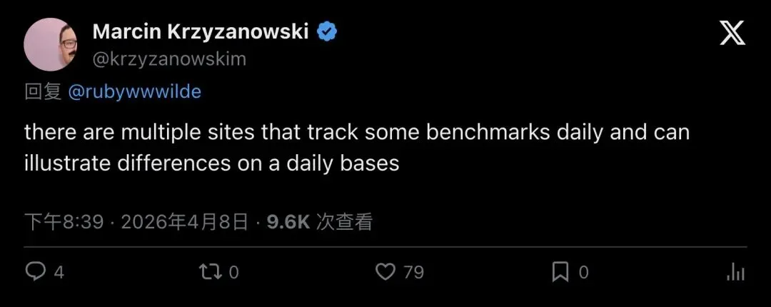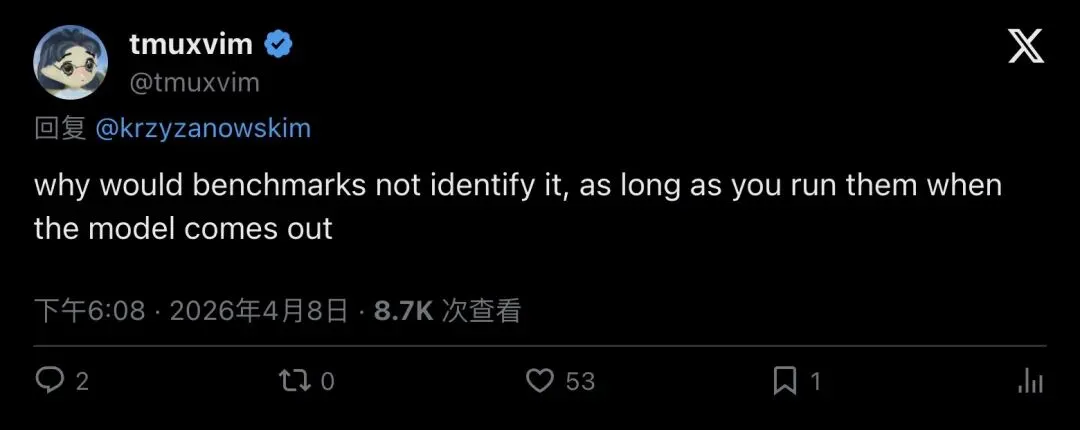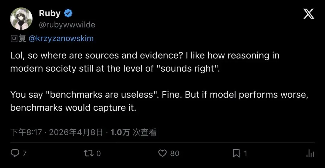 她还补了一刀:"你说benchmark没用?行。但如果模型真的变差了,benchmark一定能捕捉到。"