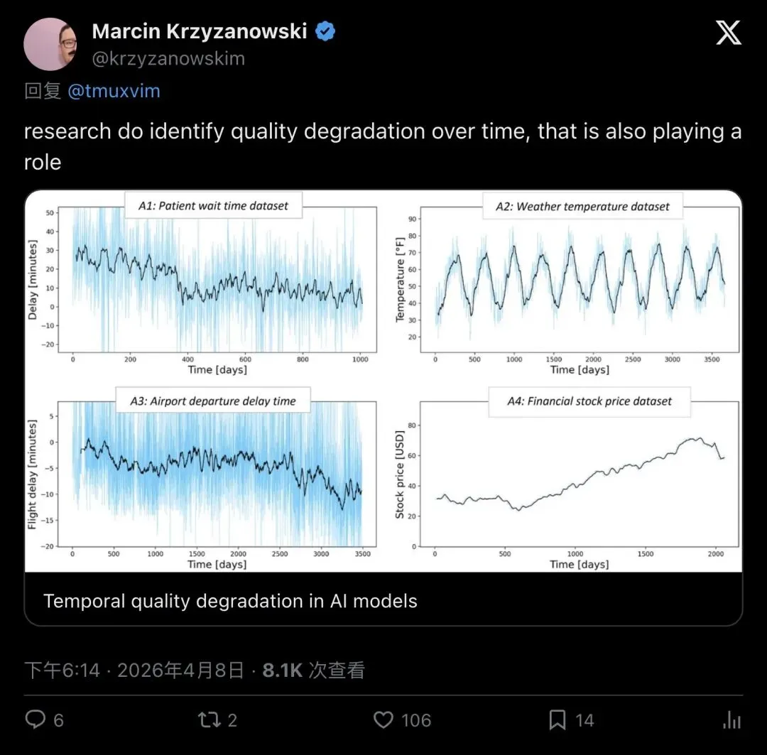 ▲ Krzyzanowski贴出研究图表:有论文识别出AI模型的质量退化现象