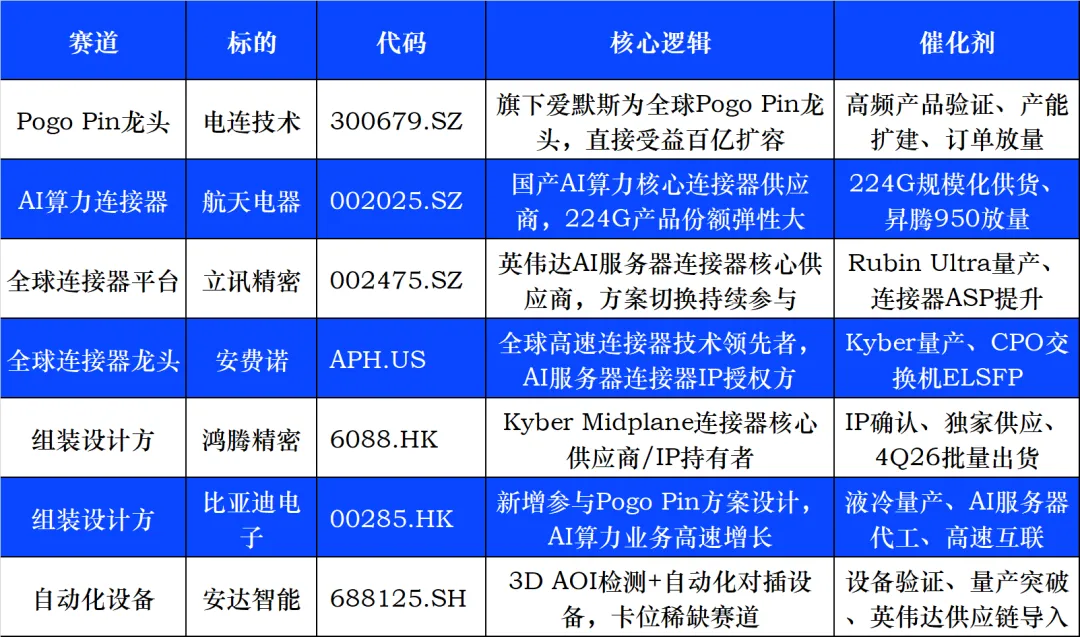 据天风证券2026年4月最新点评,海外和国内两大计算芯片龙头已同步推动高速连接器PIN针向Pogo Pin切换,并已成为确定性趋势。广发证券对鸿腾精密的深度跟踪亦确认:Kyber架构将转向Pogo Pin形态,连接器高精度组装将成为核心壁垒。