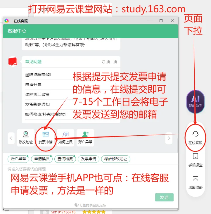 购课7天退款期过后才能申请发票,发票由网易提供,申请方法见下图。