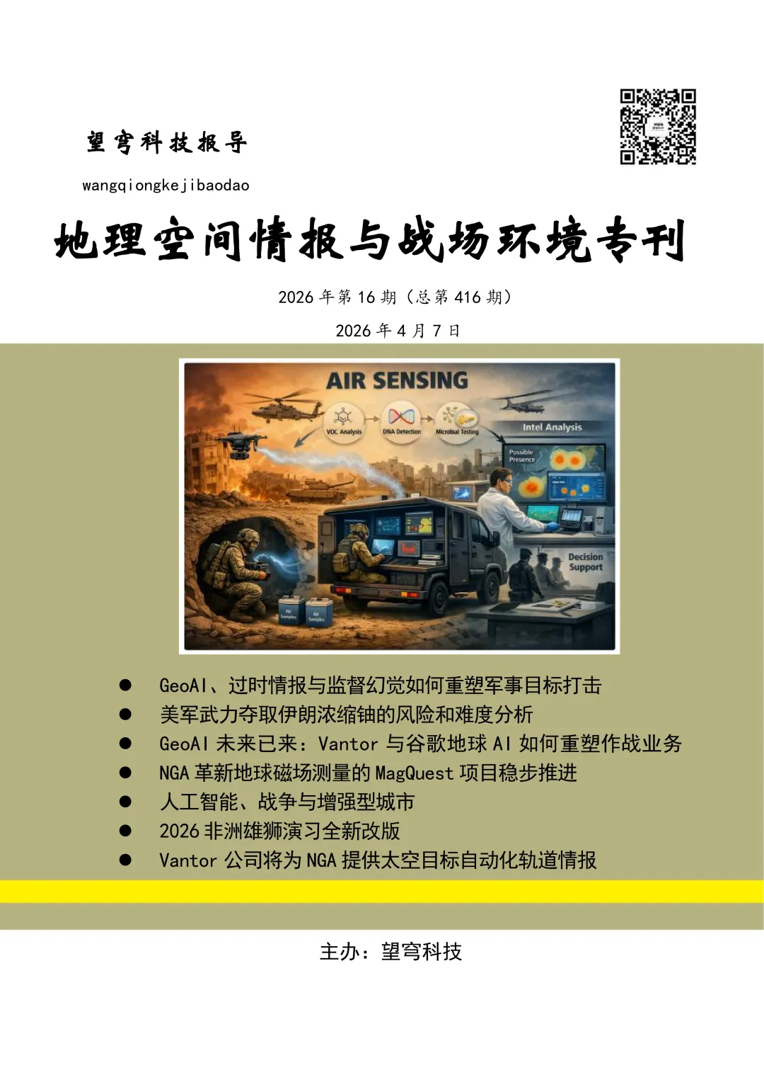 《望穹科技报导-地理空间情报与战场环境专刊》2026年第16期(总第416期)于4月7日发布,聚焦地理空间情报技术发展与现代战争形态演变,涵盖美以伊冲突动态、AI军事应用、多国军演等核心议题。