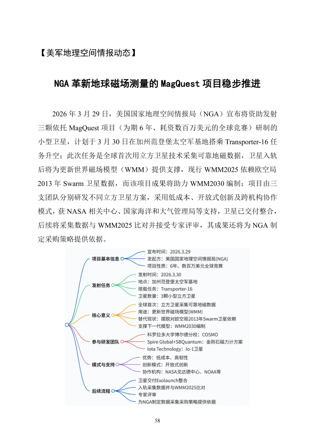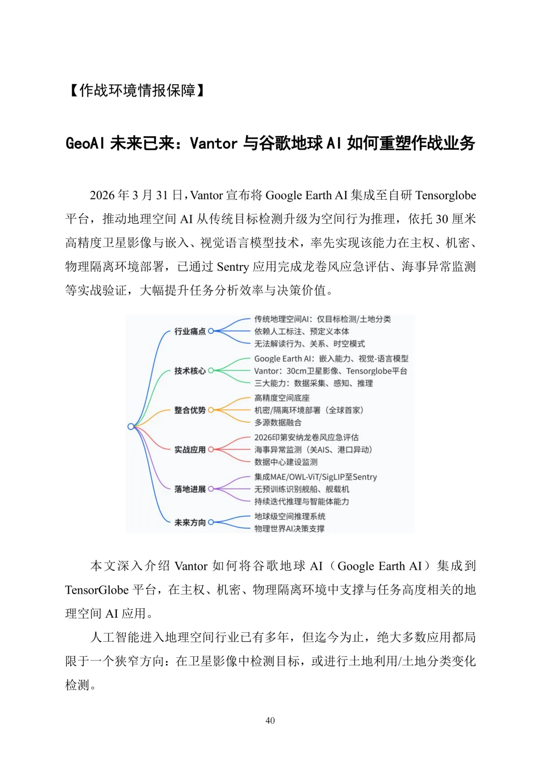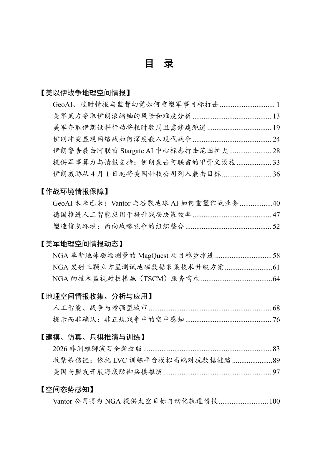 作战环境情报保障板块介绍Vantor与谷歌地球AI的技术整合、德国AI战场决策工具研发等进展。美军地理空间情报动态板块聚焦NGA的MagQuest 地磁测量项目、立方星发射及技术监视对抗服务需求。此外,刊物还涵盖人工智能对城市作战的影响、非正规战争中的空中感知技术应用、2026非洲雄狮演习改版、竹鹰联合军演及海底防御兵棋推演等内容,全面呈现地理空间情报领域的技术革新与实战应用,为军事决策与技术发展提供重要参考。