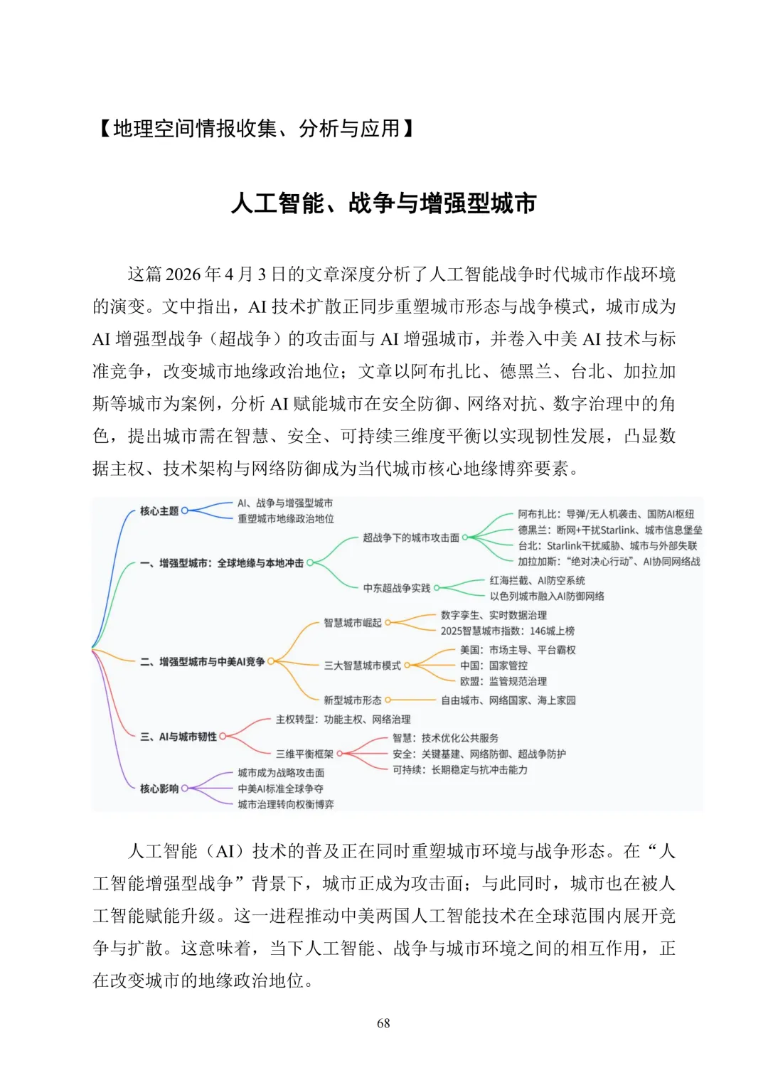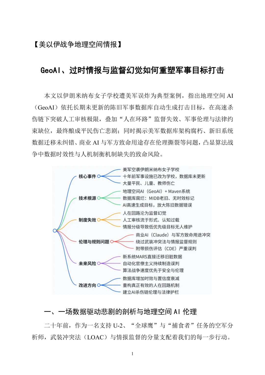 封面聚焦伊朗伊斯兰革命卫队警告袭击阿联酋Stargate AI数据中心事件,标志地区冲突打击范围向数字基础设施延伸。正文设七大板块,美以伊战争地理空间情报板块深入分析GeoAI应用缺陷导致的美军误炸伊朗女子学校悲剧,剖析数据库陈旧、人机协同失衡等系统性问题;同时详解美军武力夺取伊朗浓缩铀的高风险与复杂性,以及双方网络战、科技企业打击等对抗态势。