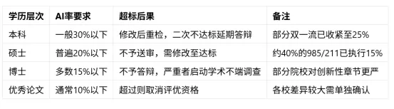 比如2025年硕士论文普遍要求25%~30%,2026年已调整为20%;惩罚力度加大,部分高校增加了"学术诚信约谈"等环节;检测节点前移,不少高校将AIGC检测提前到了中期检查和预答辩阶段。