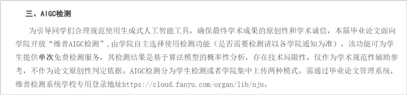 面对现阶段AIGC检测存在的争议,南京大学本科生院发布《关于加强2025年本科毕业论文(设计)管理工作的通知》,明确表示,本届毕业论文面向学院开放“维普AIGC检测”,由学院自主选择使用检测功能,其检测结果是基于算法模型的概率性分析,存在技术局限性,仅作为学术规范性辅助参考,不作为论文原创性判定依据。