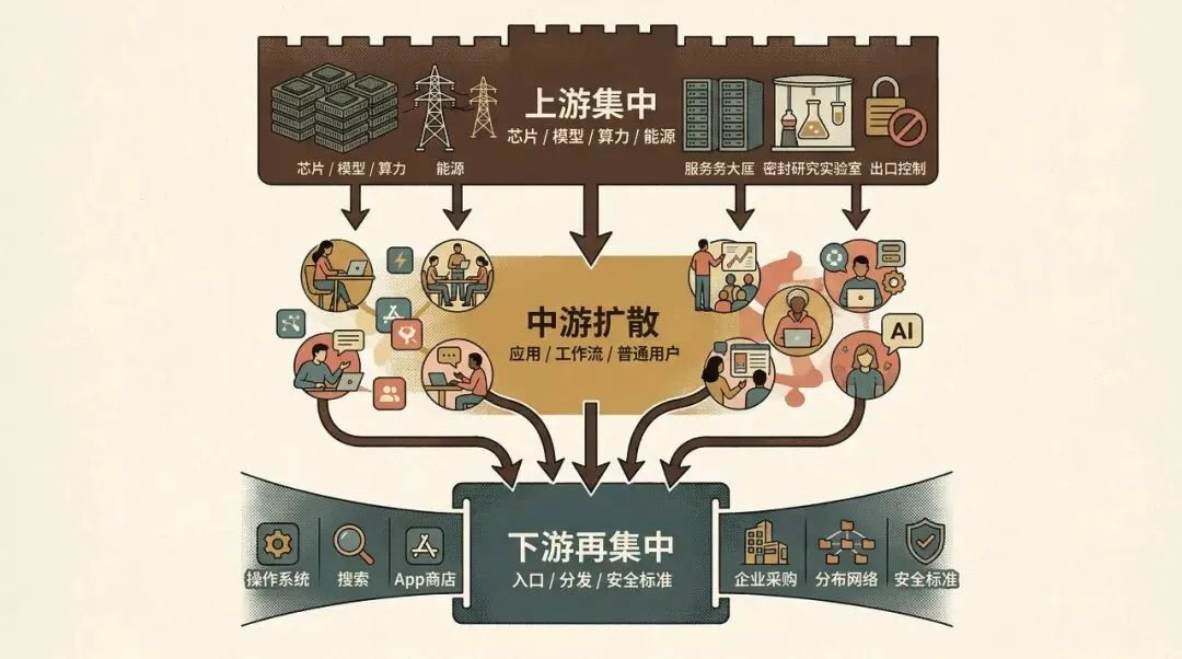 它会把权力压缩到几个关键节点上:少数芯片供应、少数云平台、少数默认入口、少数接口和分发资格、少数牌照和合规通道。