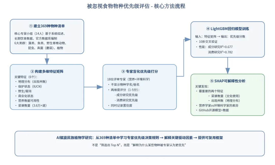 方法论上,这项研究做了三件民族植物学非常需要、但传统方法难以同时完成的事情:首先,它将“文化使用”量化。研究通过3.6万余道菜谱,把物种在日常生活中的活跃度转化为可计量变量,而不是停留在“常见/罕见”的主观印象。其次,它把“多位专家的直觉”转化为可分析模型,通过机器学习与SHAP展示不同特征的边际贡献,使研究者能够清楚看到哪些因素真正影响优先级判断。第三,它利用可解释AI作为跨学科对话工具,显示营养学家与环境科学家关注重点的异同,从而为跨学科协作提供共同语言。对应到民族植物学研究中,可以将访谈、菜谱、药方、仪式记录与市场调查等资料进行结构化整理,并据此开展三个可操作步骤:一是在构建物种清单时为每个物种设计可量化特征,不仅记录“可食用/药用”,还可加入空间分布、文献或访谈出现频次、市场交易与产品化情况,以及已有营养或药理数据,为后续模型提供输入;二是组织“盲化优先级打分”,仅提供特征信息而非物种名称,让专家或社区知识持有者为优先调查、保护或推广打分,并标注置信度;三是与数据科学家合作运行可解释模型,即便是简单的树模型结合SHAP,也足以揭示不同群体判断的共性与差异,以及反复被使用的决策变量,如文化价值、药用广度、市场潜力或濒危程度。通过这种方式,AI并不会替代田野工作,而是将田野数据和专家经验转化为可复用、可比较、可与政策对接的决策工具,并显著增强“如何组织、解释与传达答案”的能力。