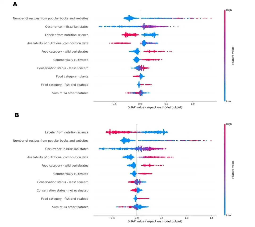 图2 用于确定物种研究优先级的因素:(A)食物成分研究;(B)食物消费研究。SHAP 值反映了各特征对模型预测优先级评分的贡献程度。