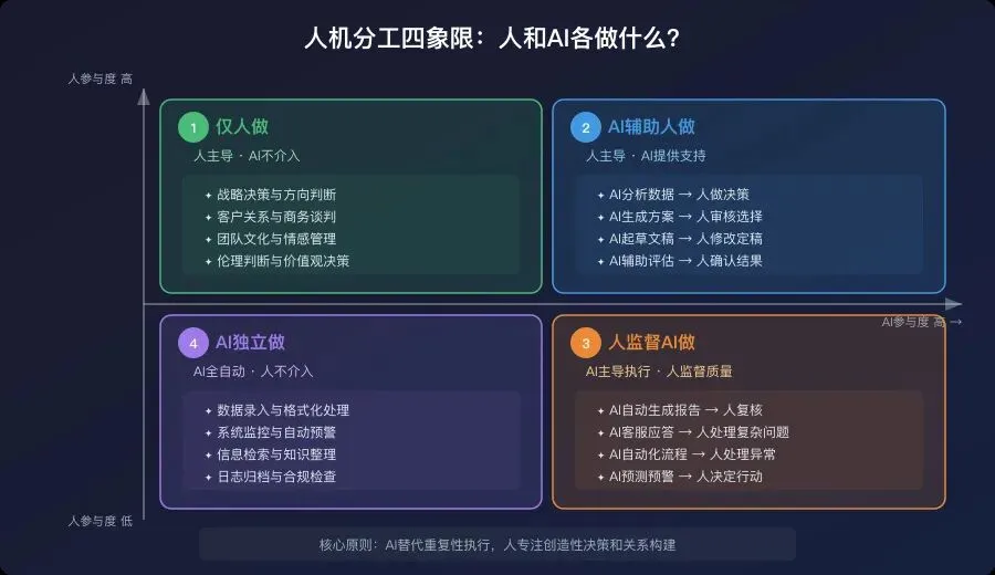 传统系统管理的是固定的岗位——一个萝卜一个坑。AI时代需要管理的是动态的角色——一个人可能同时扮演多个角色,每个角色都有明确的"人做什么"和"AI做什么"。