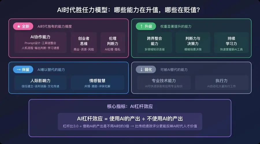 传统胜任力模型重视"专业技术"和"执行力"。AI时代,这些恰恰是最容易被替代的。真正稀缺的能力变了。