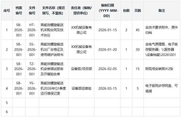 ✅1. 编号规则:档案编号建议遵循“SB-年份-设备类别-序号”(如SB-2026-01-001,01代表生产设备);文件编号按文件类型缩写+年份+序号(如HT-2026-001,HT=合同、SS=说明书、TZ=安装、YS=运维),无企业现有规则可直接套用此规则。