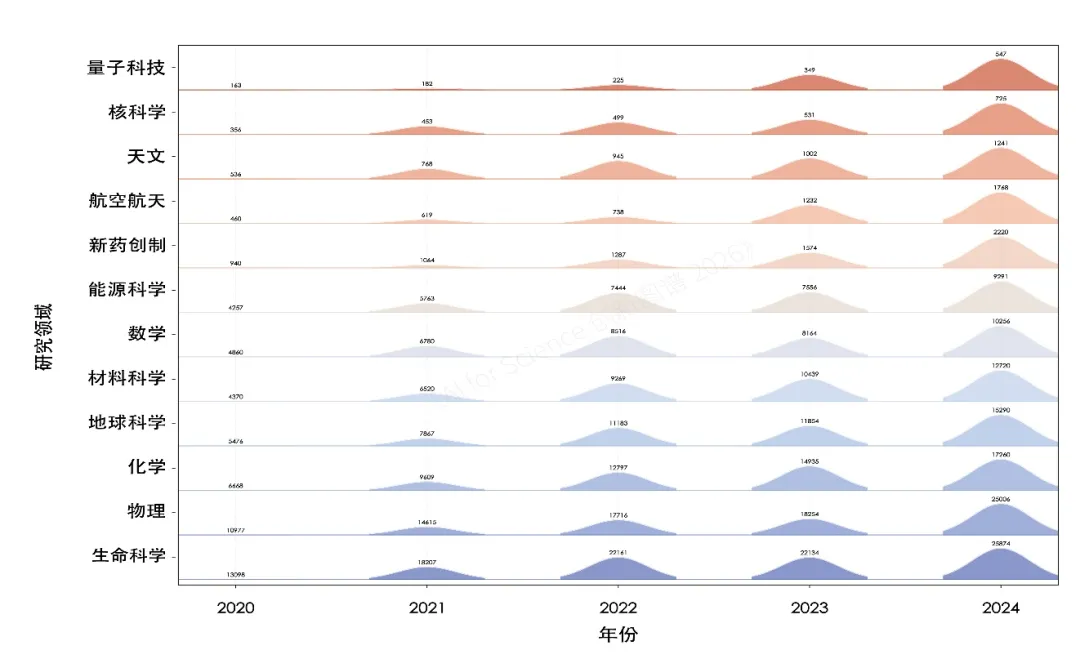 基于学术论文数据的分析显示,近五年全球AI for Science论文发表量增长超一倍,人工智能与各学科融合不断深化。生命科学、物理、化学、地球科学、材料科学等领域活跃度最高,而航空航天、量子科技、材料科学等领域增速尤为迅猛,年均增长率超过30%。这反映出AI新范式正快速渗透至科学研究的各个角落。