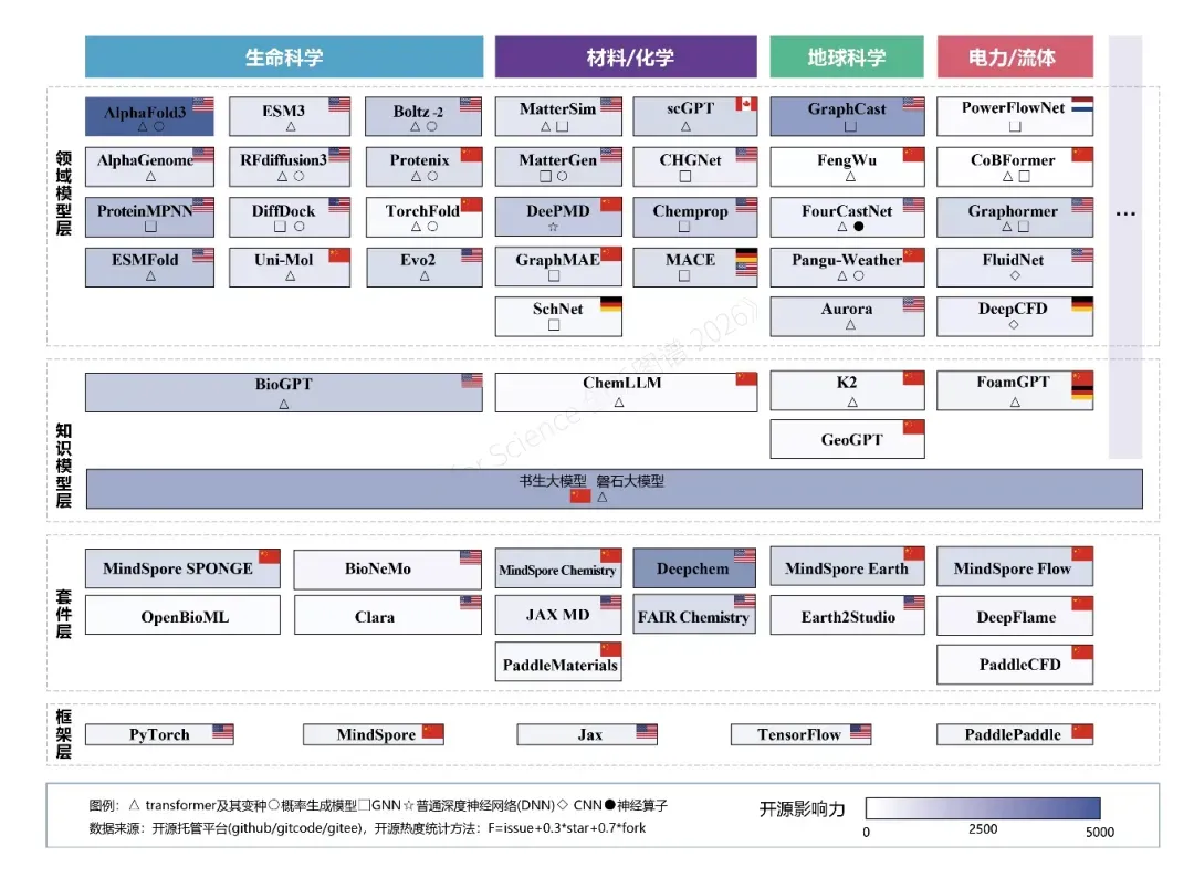 报告强调,由文献数据、实验数据、模拟数据和模型数据构成的AI for Science数据生态初具雏形。各类数据通过深度关联形成结构化、可解释的AI-Ready体系,成为科学发现的知识底座。同时,开源项目作为核心驱动力,从框架层、套件层到模型层,一批代表性开源工具日趋成熟,中国的开源影响力显著提升。