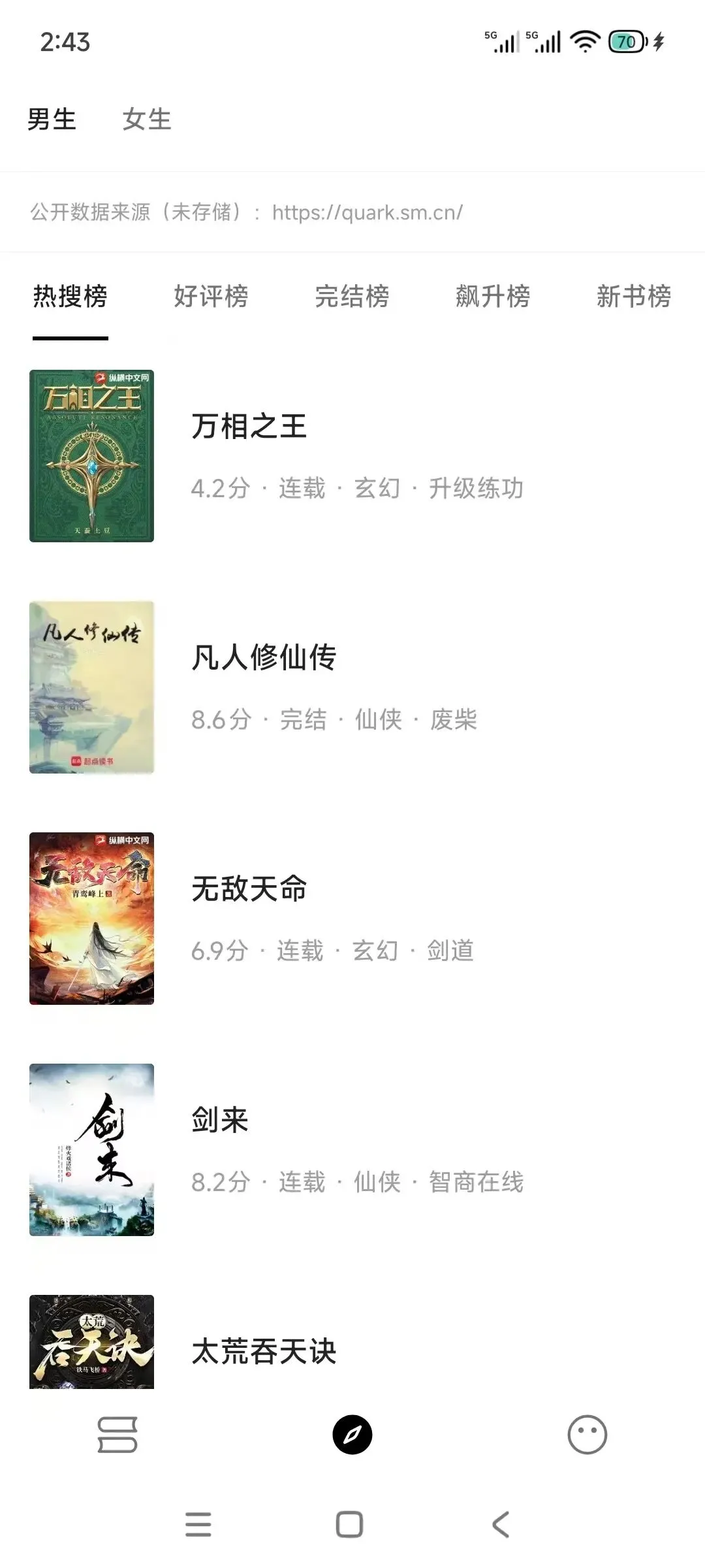 首次进入元气小说,APP 会自动导入书源,所有资源来源于网络,根据性别选择对应的版块,如果不知道阅读哪些内容,首页会自动推荐一部分最新热门小说,点击直接阅读。