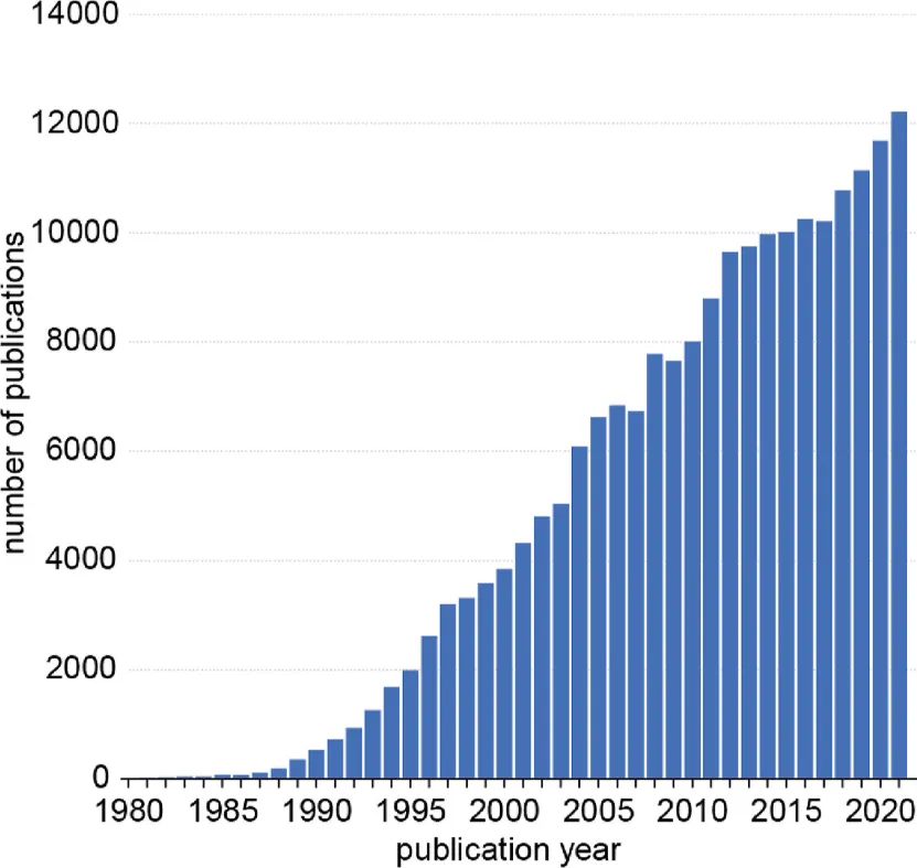 发文数量在 20 世纪 80 年代至约 1997 年间呈指数式增长,此后增长趋势趋于不均衡但整体近似线性。在 2012—2017 年间发文量接近平台期后,近年来年发文量再次呈现上升趋势。
