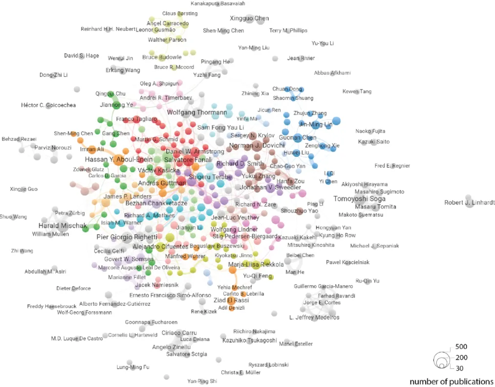 毛细管电泳作为现代分析化学的重要分离技术之一,历经四十余年的发展,已从早期以分离效率和检测灵敏度为核心的基础方法学研究,逐步拓展至基因组学、蛋白质组学、代谢组学以及临床诊断等多学科交叉领域。本文通过系统的文献计量学分析,对全球毛细管电泳研究的知识结构、合作网络及主题演化进行了全景式梳理,不仅回顾了该领域的技术演进路径,也揭示了其与质谱技术、电化学传感器及纳米材料等方向的融合趋势。