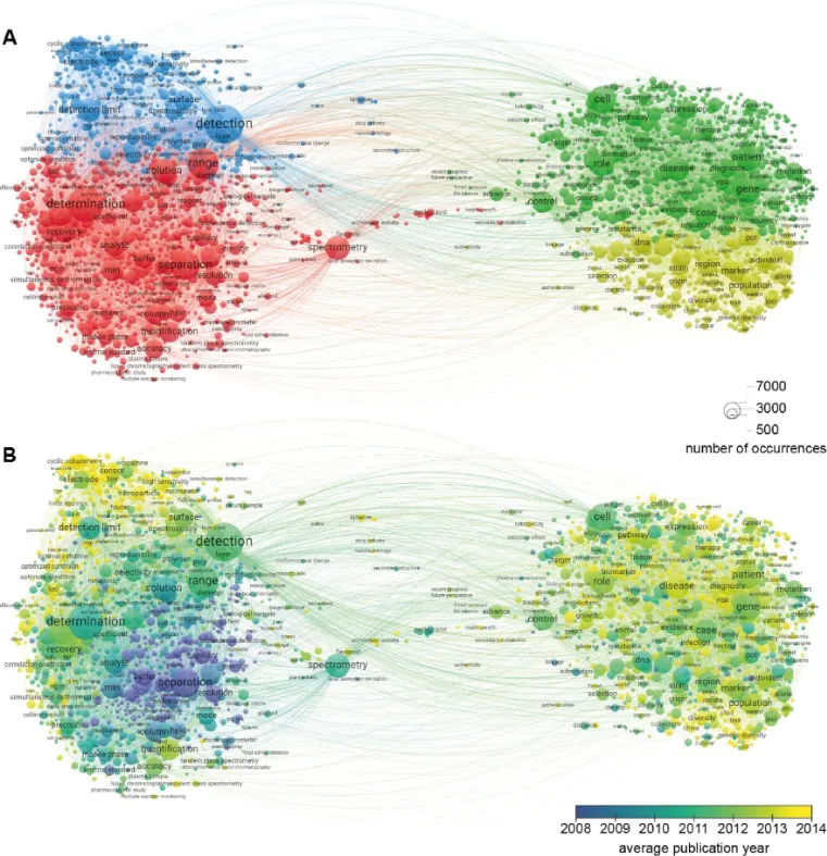 术语图中最“热点”的区域位于左上角,主要由与电化学传感器相关的术语构成,包括“electrochemical sensor”,“electrocatalytic activity”,“differential pulse voltammetry”,“nanoparticle”,“nanocomposite”,“graphene”,“graphite oxide”等。然而,在较成熟的研究主题中也存在热点。例如 DNA 测序聚类中的“next generation sequencing”和“NGS”可能源于将毛细管电泳作为被替代技术进行对比的研究,而非其新的应用方向。但也有一些术语反映了新的研究趋势,如代谢组学领域。另有一些特殊案例,例如“SARS-CoV”这一术语的平均发表年份接近 2020 年,说明与 SARS-CoV-2 相关的毛细管电泳研究论文数量远超 2002—2004 年首次 SARS 疫情期间的相关研究。这一现象并不意外,鉴于两次疫情规模差异巨大以及 COVID-19 相关论文数量极其庞大。