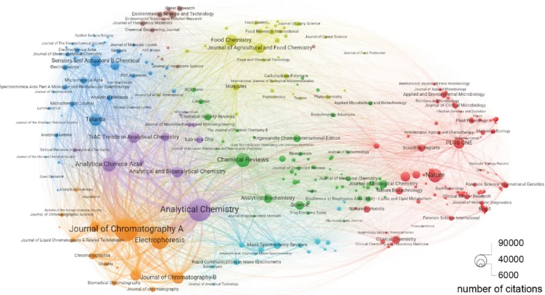 在文献计量耦合分析中(图 4),期刊根据其研究主题形成不同聚类。电化学与传感器类期刊构成一个主要聚类(蓝色);质谱期刊与蛋白质组学期刊聚为一类(青色);食品化学(黄色)与环境化学(棕色)期刊分别形成独立聚类。Nature、PNAS 和 PLoS One 等综合性期刊与临床、法医学和遗传学期刊聚为一类,表明毛细管电泳在这些领域的应用已获得广泛关注。