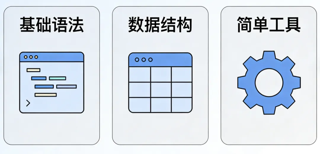 - 变量:给数据起个名字(比如把“用户年龄”叫做“age”); - 函数:一个固定的操作(比如“计算用户平均年龄”就是一个函数); - 循环:重复做一个操作(比如重复统计1000条用户数据)。
