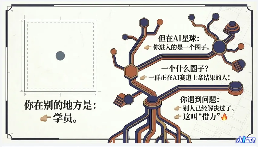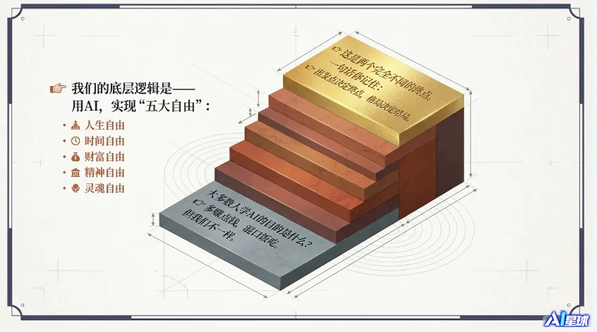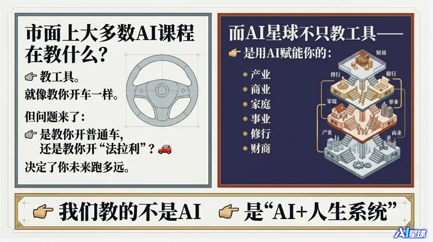市面课程:只教 AI 工具操作,教你怎么用软件、点按钮。AI 星球:教AI + 人生全维度系统,用 AI 赋能你的事业、家庭、财富、成长,目标是五大自由。