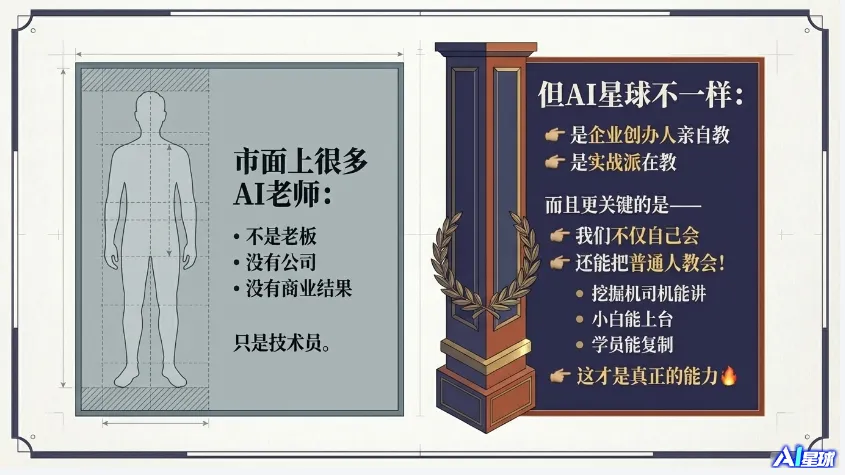 市面课程:老师多是技术员,没开过公司,没商业结果。AI 星球:企业创办人、实战派企业家亲自教。我们不仅自己会,更能把普通人教会 —— 挖掘机司机能学会,小白能上台,学员能复制结果,这才是真能力。
