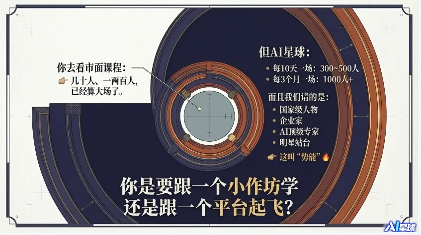 市面课程:一场课几十人、一两百人,就是上限。AI 星球:每 10 天一场 300-500 人实战课,每 3 个月一场 1000 人 + 峰会;我们邀请国家级人物、顶尖企业家、AI 顶级专家、明星站台赋能。你不是在上课,你是在借时代的势能、平台的势能、圈层的势能。