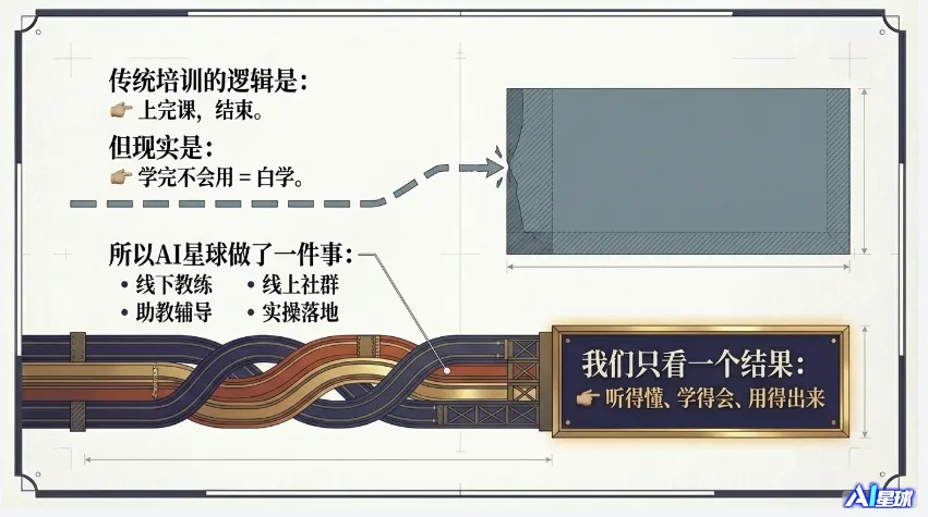 市面课程:交钱→听课→结业,结束。AI 星球:线下教练 + 线上社群 + 助教辅导 + 实操落地。我们只有一个标准:听得懂、学得会、用得出来。学不会、用不上,我们比你更着急。
