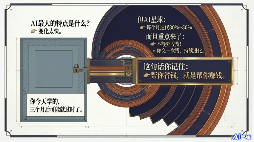 AI 最大的风险,就是过时。市面课程:内容几年不更新,学完就淘汰。AI 星球:每月内容迭代 30%-50%,而且不额外收费。一次选择,终身进化,帮你省钱,就是帮你赚钱。