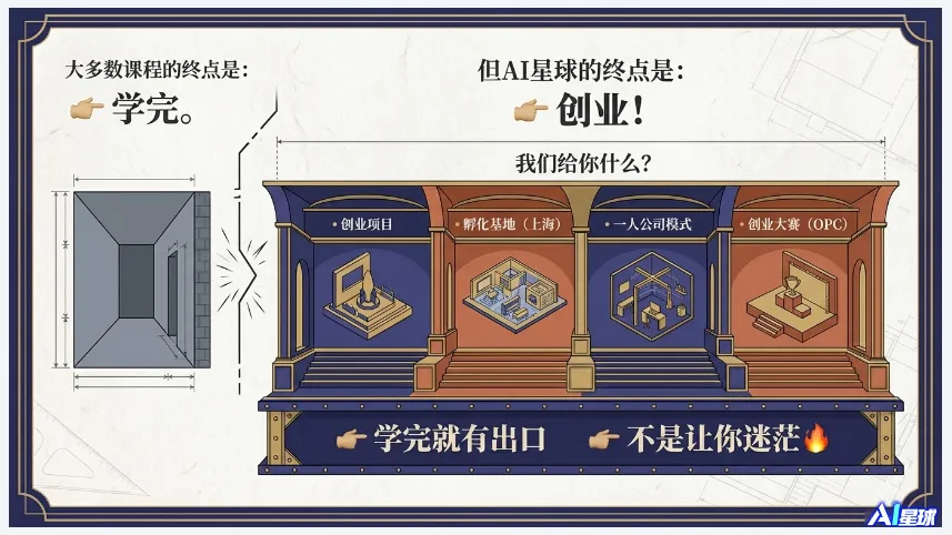 市面课程:终点是 “学完了”。AI 星球:终点是让你能创业、能变现、能独立拿结果。我们给方法、给圈子、给资源、给支持,让你从 AI 小白,变成 AI 创业者。